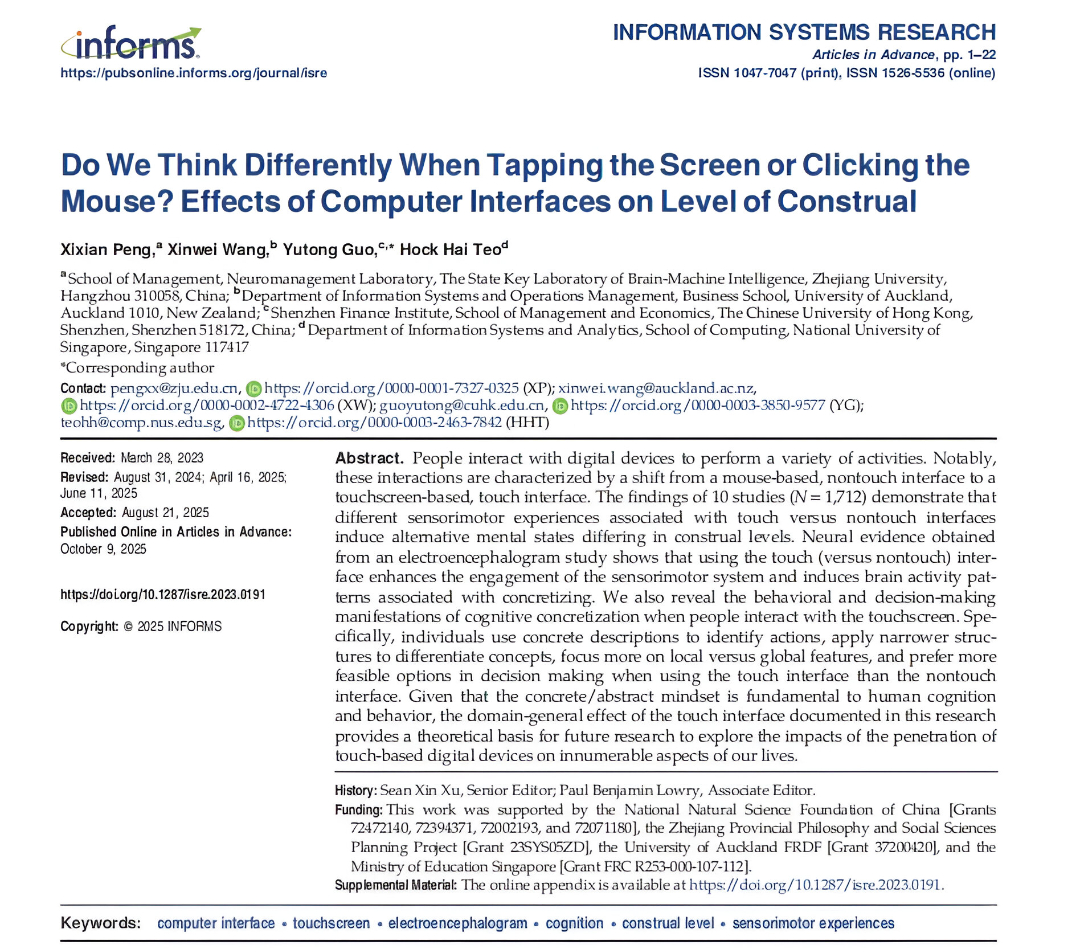 A research team from the Neuromanagement Laboratory of the School of Management at Zhejiang University, in collaboration with several other universities, published their findings in the top international journal Information Systems Research (UTD24, FT50). For the first time, they revealed the profound impact of touchscreen and non-touchscreen interfaces on the level of human cognitive interpretation from the interdisciplinary perspective of neuroscience and psychology, providing a new perspective for understanding the connection between digital interaction and brain thinking.